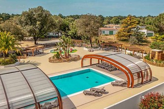 Note Google 4,4/5, saison du 4 avril au 27 septembre. À 1,5 km des plages, accessibles via les 110 km de pistes cyclables de l’île — vélo et pétanque sont les modes de déplacement privilégiés. Piscine couverte chauffée, restaurant Le Poséidon avec produits locaux.
